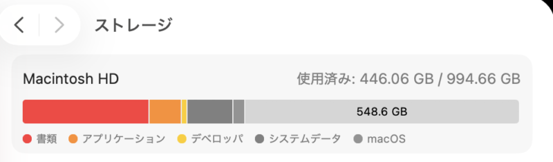 Spotlight再構築後、ストレージ表示も正確になり、システムデータ肥大化が完全に解消されました。しばらく放置しても増え続ける状況になっていません。